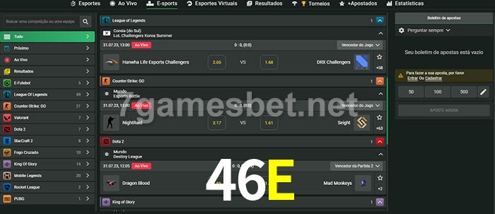 O 46E oferece uma grande seleção de opções de apostas em e-sports com probabilidades competitivas